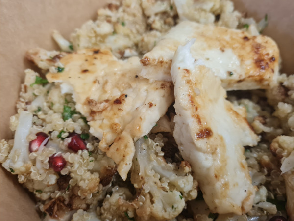Salát s pečeným květákem, quinoou, granátovým jablkem a grilovaným halloumi